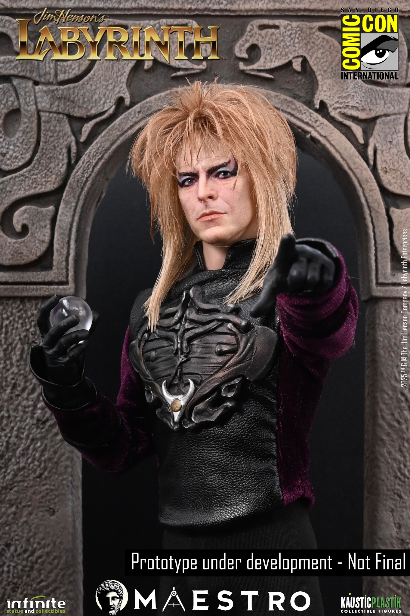 David Bowie aus Labyrinth. Es handelt sich dabei um frühe Prototypen. Teilweise wird es die Figuren in zwei Varianten mit unterschiedlichen Kostümen geben, mit Austauschköpfen und noch jeder Menge Zubehör.
